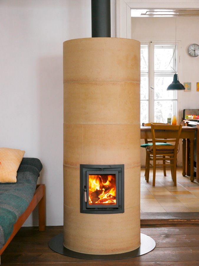 - Die Energie aus dem Holz wird in der Masse des Ofens gespeichert.