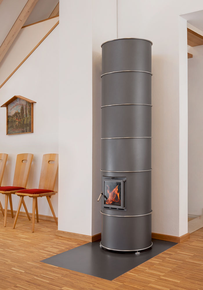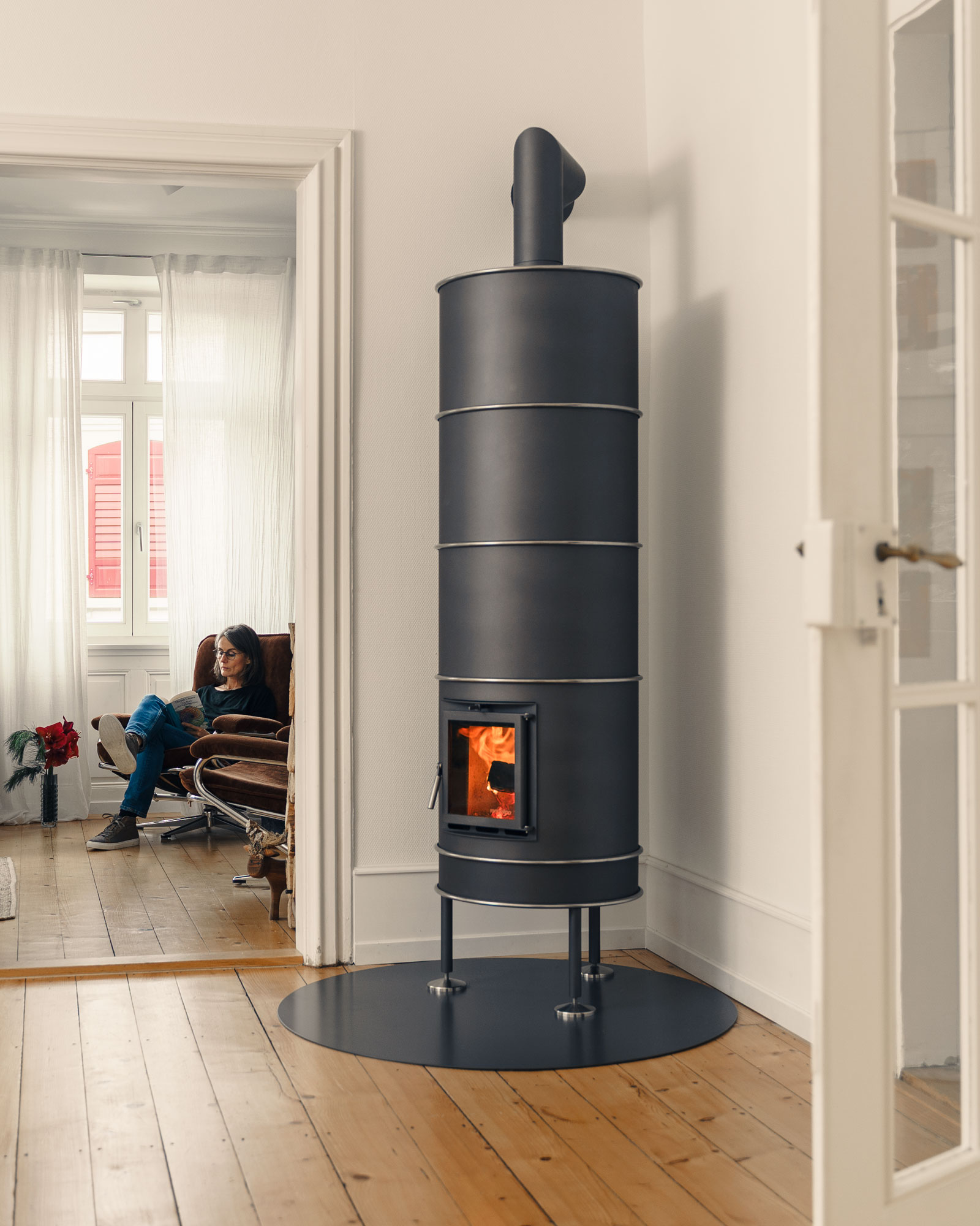 Der Speicherofen ist auf Füßen oder mit geschlossenem Basismodul erhältlich. Die Funktion bleibt die gleiche. Die ringförmigen Speicherelemente werden mit Spannringen aufeinander fixiert. Sie sind aus Edelstahl und können auf Wunsch auch in der Ofenfarbe lackiert werden.