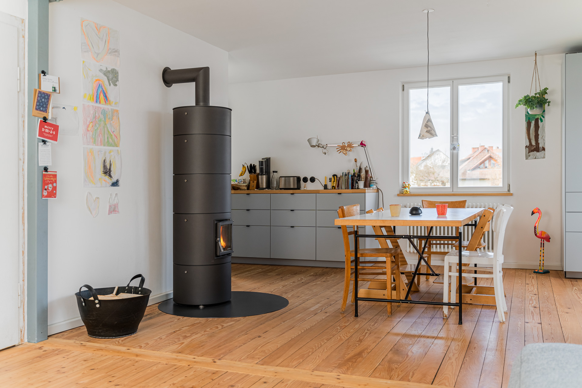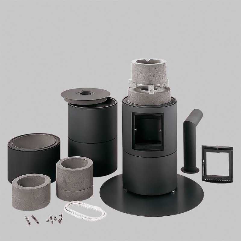Äußerlich erinnert unser modularer Kleinspeicherofen rondolino aufgrund des Metallmantels an einen Kaminofen. Die Speicherringe sind mit Schamotte vergossen und strahlen die Wärme besonders schnell ab. Im Inneren beherbergen sie ein effizientes Rauchzugsystem. Der vergleichsweise leichte und schlanke Aufbau ist eine Weiterentwicklung des Innenlebens unseres Grundofens rondo.
